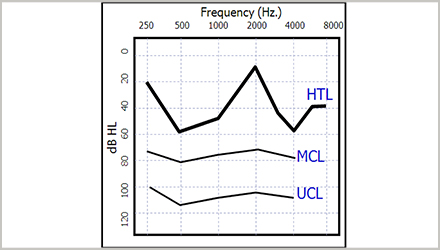 根據研究表明,不規則型聽力損失的弱聽人士,其MCL(舒適閾)曲線與UCL(不舒適閾)曲線通常比聽閾曲線更加平坦,如下圖所示為HTL(聽閾)曲線、MCL曲線和UCL曲線。