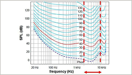 接下來我們再來看一看等響曲線。等響曲線簡單來說,是指聽力正常者感覺響度相同時的純音聲壓級與頻率關系的曲線。