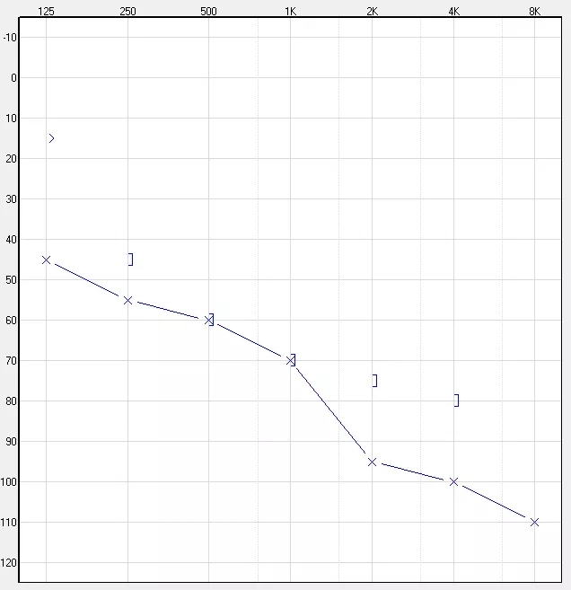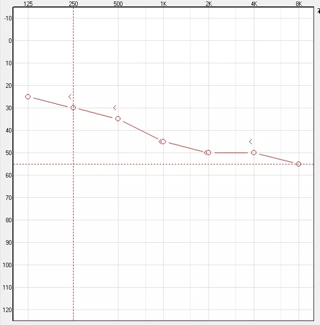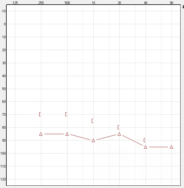 高頻陡降型聽力損失,一般為低頻正常或者輕度聽力下降,中高頻聽力快速下降至重度或極重度水平。造成此類聽力損失的原因一般是接觸了耳毒性藥物(如:慶大霉素、鏈霉素、卡那霉素)。日常生活中表現為非常明顯的“聽得見,聽不清”的現象,并且脫離看口型后言語識別率大幅度下降。