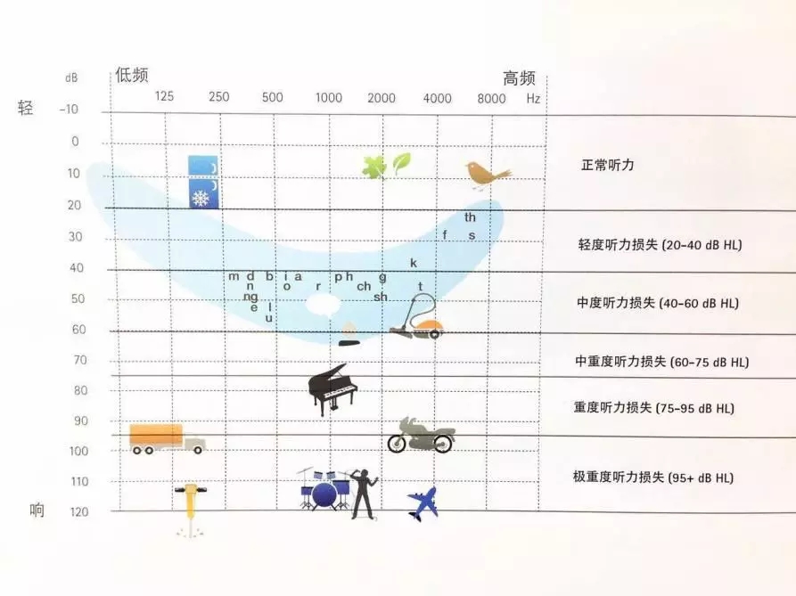 如圖所示,我們可以知道2000hz以上的發音更多影響清晰度。高頻陡降型聽力下降者,由于低頻好,所以能夠聽到大部分日常交流的聲音。但是由于高頻嚴重損失,有很多高頻的言語信息無法獲取,所以經常聽不清談話內容。