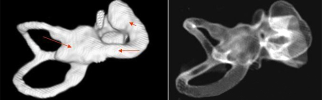 先天性內耳畸形的疾病種類繁多,診斷比較困難,隨著高分辨CT和磁共振(MRI)的應用,目前診斷率不斷提高。臨床常見的內耳畸形包括大前庭導水管綜合癥、先天性耳蝸畸形、米歇爾聽障及沙伊貝聽障。本篇將后三種畸形介紹如下:</p><p> 先天性耳蝸畸形(Congenital cochlear malformation)</p><p> 先天性耳蝸畸形又稱Mondini內耳發(fā)育不全,是最常見的一種內耳畸形。</p><p> 1、病因</p><p> 本病可為常染色體顯性或隱性遺傳病,也可為非遺傳性因素,如風疹病毒感染、過多的放射線暴露以及反應停類藥物等引起。</p><p> 2、臨床表現(xiàn)</p><p> 先天性耳蝸畸形包括耳蝸扁平、耳蝸發(fā)育不良,特別是第二圈和頂圈發(fā)育不良,兩者合并為一個腔;前庭擴大,巨大的前庭導水管以及半規(guī)管畸形、內耳道擴大等癥。在具體病例中不一定以上所有的畸形同時出現(xiàn),可僅出現(xiàn)其中一種或幾種畸形。</p><p> 3、聽力學表現(xiàn)</p><p> 出生即無聽力,或1~2歲時才出現(xiàn)聽力減退,主要為感音神經(jīng)性聽障,部分可為混合性聽障,有部分患者可長期保存殘余聽力。個別患者可有眩暈發(fā)作。</p><p> 4、診斷</p><p> 主要根據(jù)聽力學表現(xiàn)和影像學檢查。通過高分辨CT可看到耳蝸畸形。內耳MRI顯示膜迷路內水充盈,耳蝸扁平,耳蝸第二圈與頂圈間隔缺損,以及半規(guī)管、前庭的畸形。</p><p> </p><center><img alt="" src="/upfiles/201903250158493159.png" width="640" height="200" /></center><p></p><p> 先天性耳蝸畸形伴前庭和外半規(guī)管發(fā)育不良</p><p> 5、治療</p><p> 目前尚無有效的治療方法。如有殘余聽力,可佩帶助聽器后進行語言康復。無殘余聽力或極重度聽障患者可考慮人工耳蝸植入。</p><p> 米歇爾聽障(Michel’s deafness)</p><p> 屬常染色體顯性遺傳,是最嚴重的內耳畸形,內耳可完全未發(fā)育,可伴有其它器官的畸形和智力障礙。</p><p> 1、診斷</p><p> 主要依靠顳骨高分辨CT和內耳MRI。</p><p> </p><center><img alt="" src="/upfiles/201903250158577271.png" width="640" height="160" /></center><p></p><p> 雙側內耳畸形:左側無內耳迷路及內耳道機構,為米歇爾畸形;右側空耳蝸及前庭擴大,為先天性耳蝸畸形</p><p> 2、治療</p><p> 目前無特殊辦法,此類病例不適合行人工耳蝸植入術,但是聽覺腦干植入術的適應癥,其效果有待進一步證實。</p><p> 沙伊貝聽障(Scheibe dysplasia)</p><p> 為常染色體隱性遺傳,是最輕的內耳畸形,畸形僅限于蝸管和球囊,故又稱耳蝸球囊型畸形。</p><p> 1、診斷</p><p> 主要根據(jù)先天性聽損和MRI檢查</p><p> 2、治療</p><p> 此病可選擇性地行人工耳蝸植入術。</p><p> 更多詳情請登錄聽覺有道助聽器www.zqsjzx.cn</p>" />