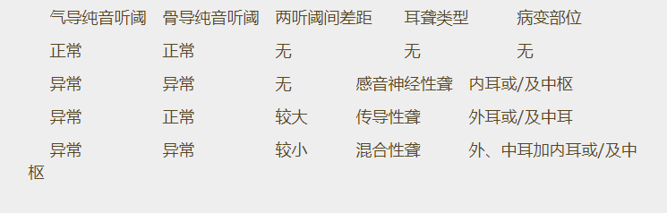 正常情況下我們是通過兩條途徑來感受聲音信號的——氣導途徑和骨導途徑。前者我們非常熟悉,從外耳到中耳到內耳到聽中樞;后者我們或許不太注意:從顱骨直接到內耳到聽中樞。相應地,純音聽力檢查也有兩種聲音剌激方式,氣導輸入和骨導輸入。前者我們天天使用,而后者則很少被我們使用。事實上,兩閾值曲線的異同正是我們判斷聽損病變部位的基礎(見下表)。了解患者病變部位對于獲得他們的信任以及確定助聽器電聲性能都有非同尋常的意義。因此,有條件的時候還是應當重視骨導聽閾測試。